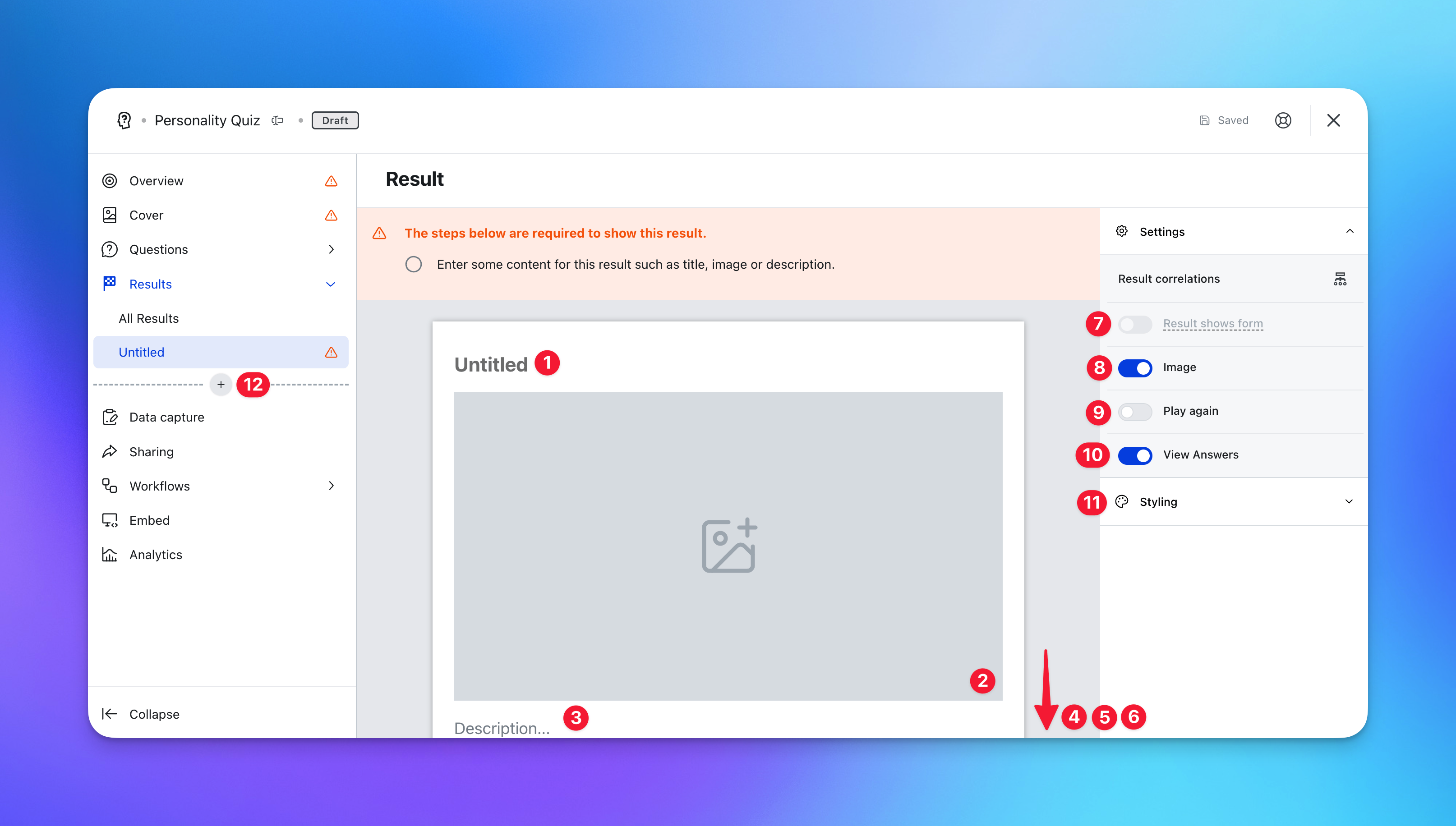 - (2) Here you can bring your result to life with an image or gif or (8) toggle the result image off here.