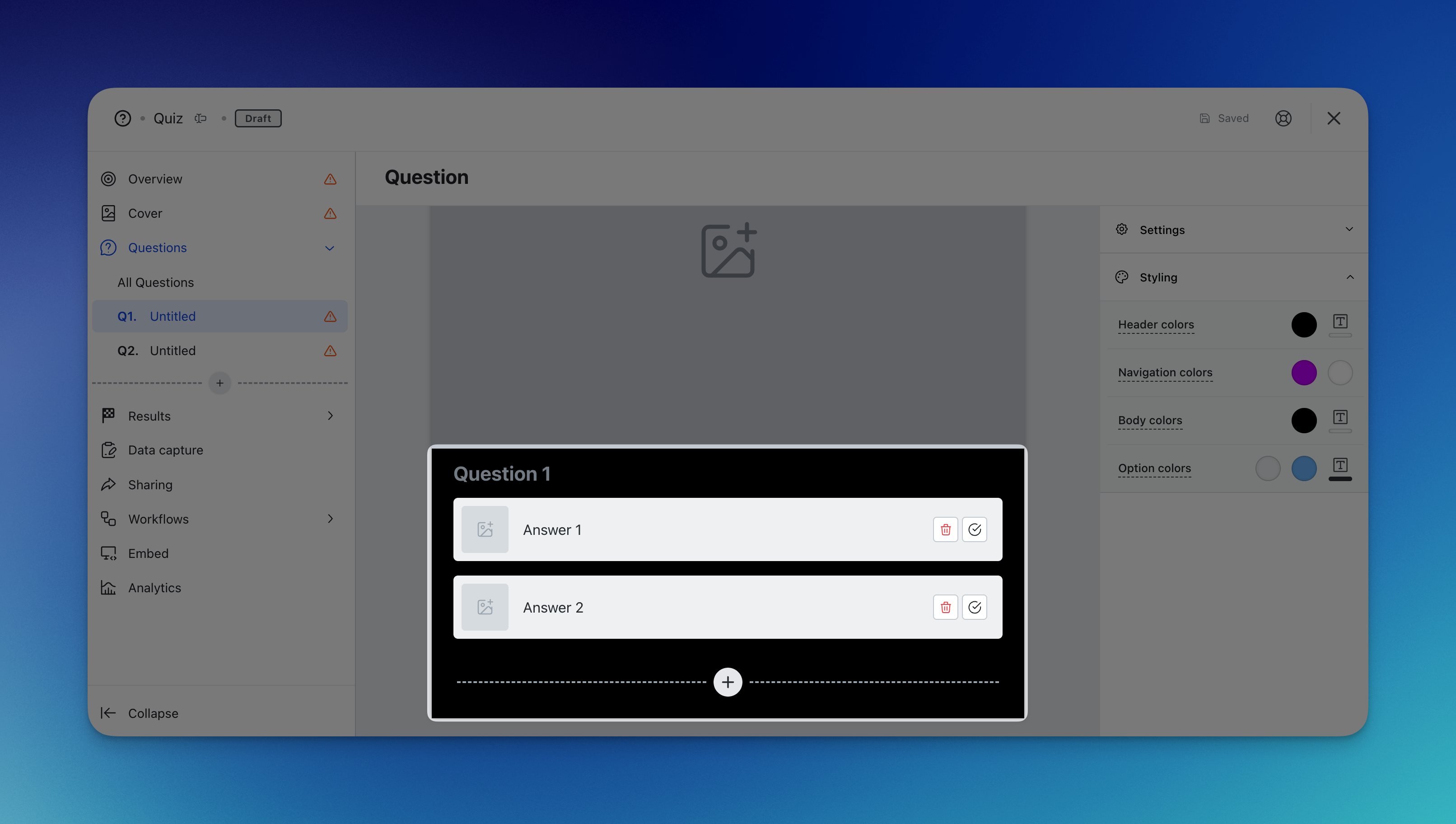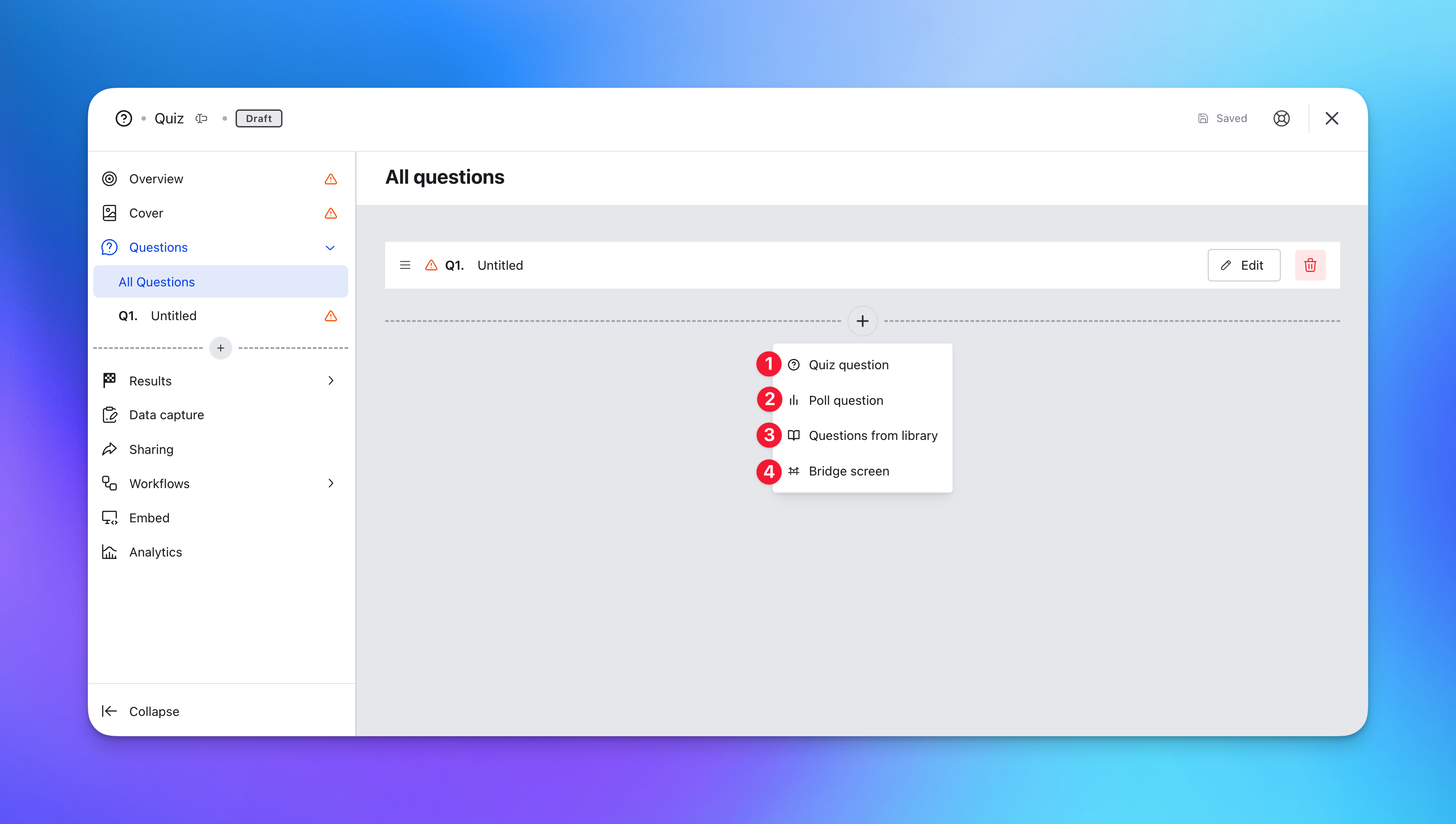 The Quiz allows you to engage your audience whilst putting their knowledge to the test by asking quiz, poll and market research style questions.How do I build one?