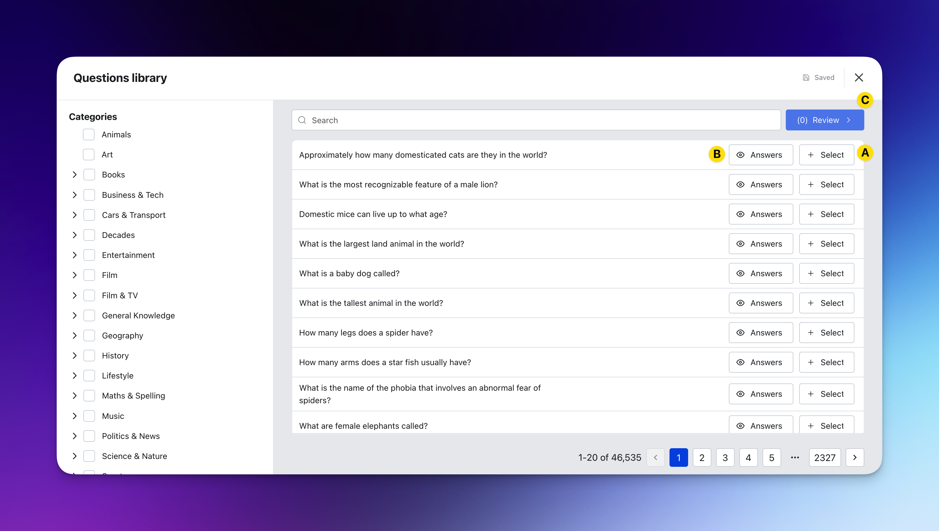 - (C) Once you have selected your questions, review your selection and add these questions to your Quiz.