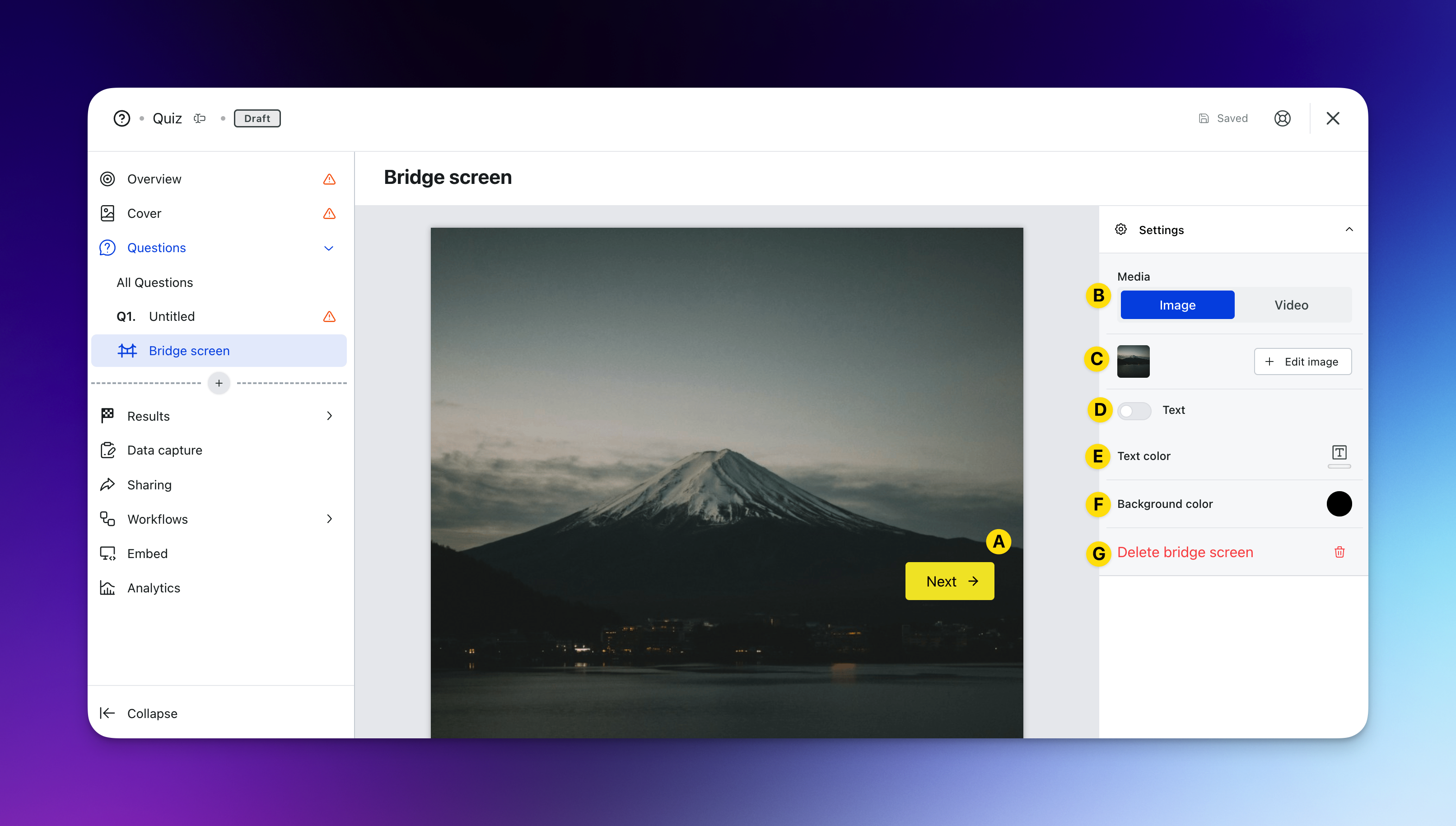 (4) Bridge screen - Gives you the ability to add a bridging screen between questions. This is a great opportunity to place adverts and promotional images within your Quiz.