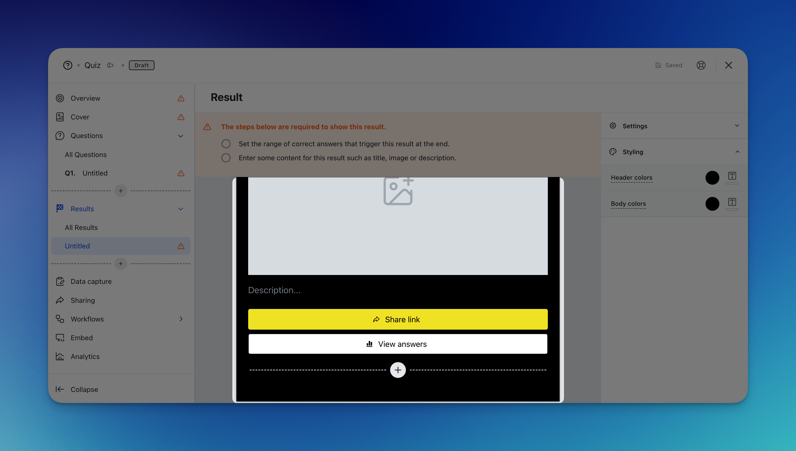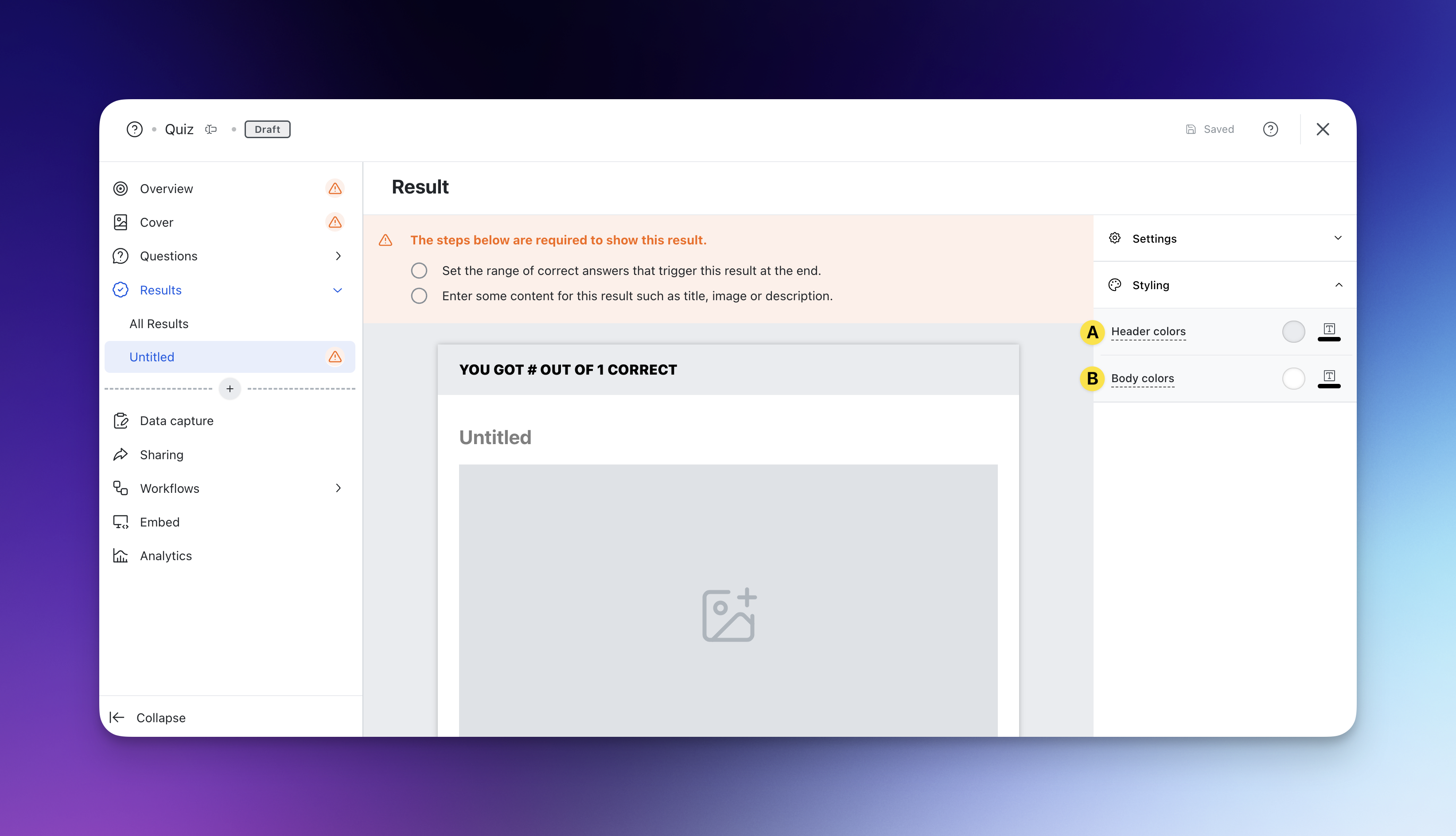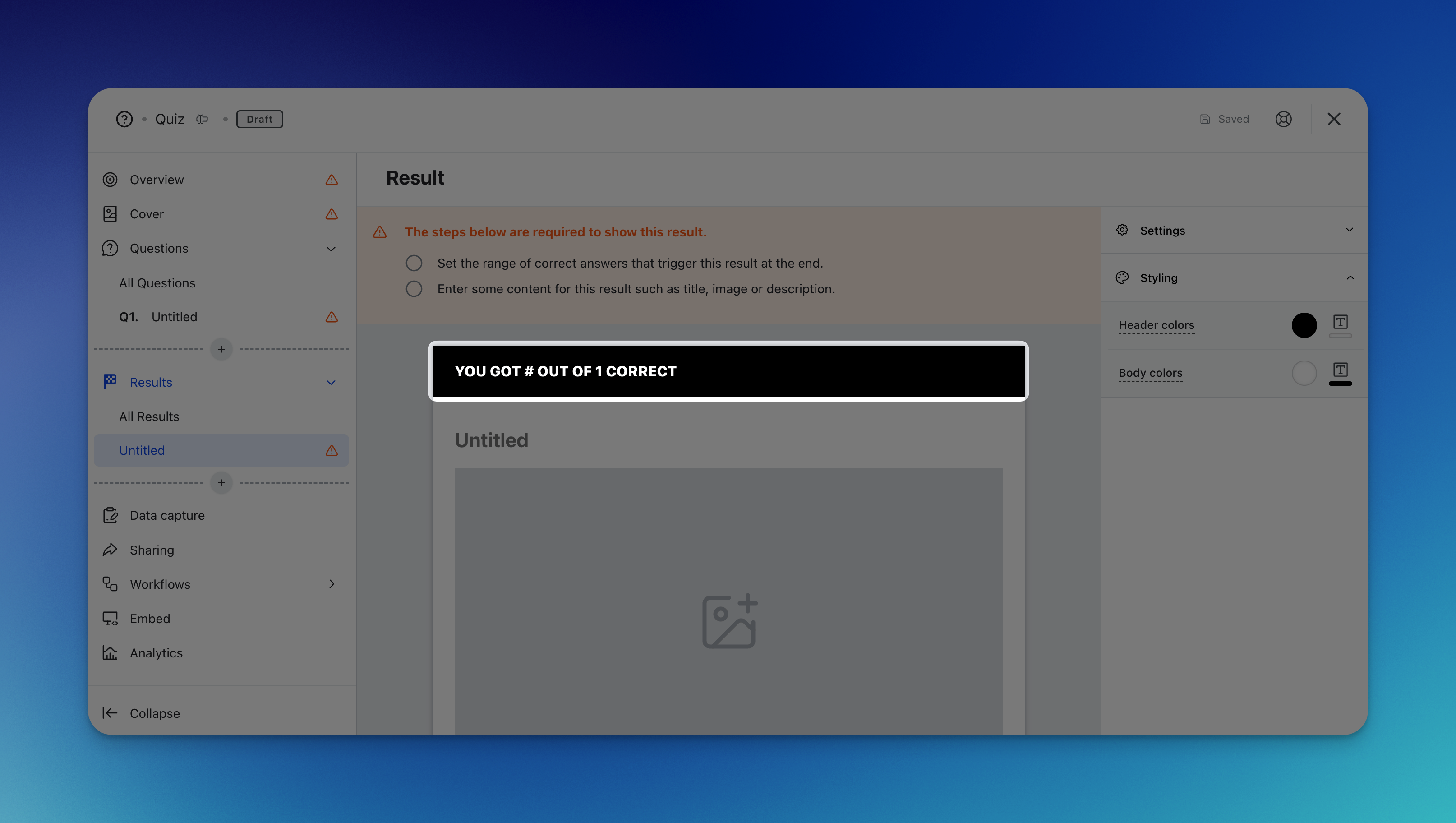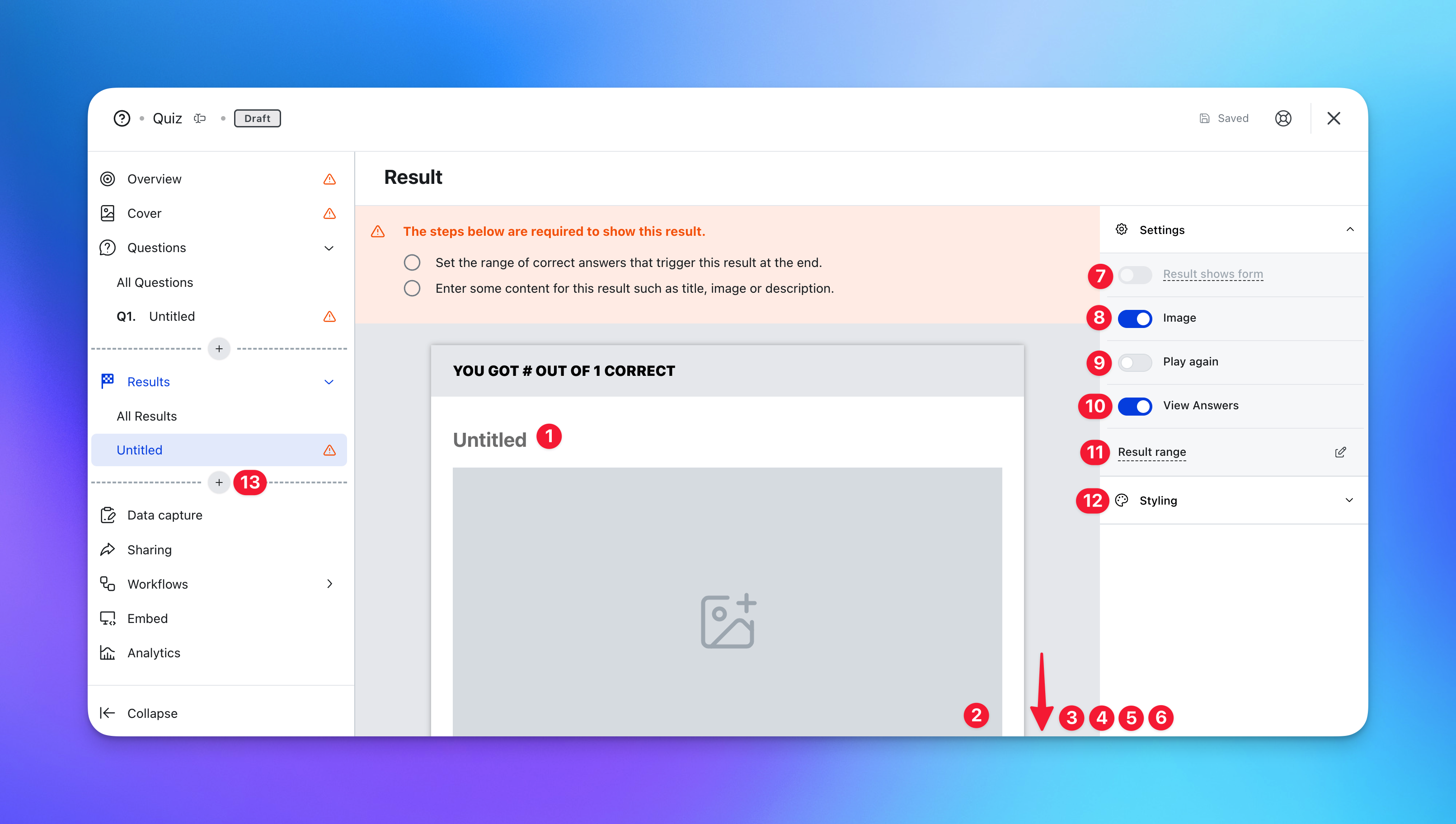 - Results refer to what will be shown to your users at the end of your Quiz. You can create multiple results which will all correspond to a different number of correct outcomes within your Quiz.