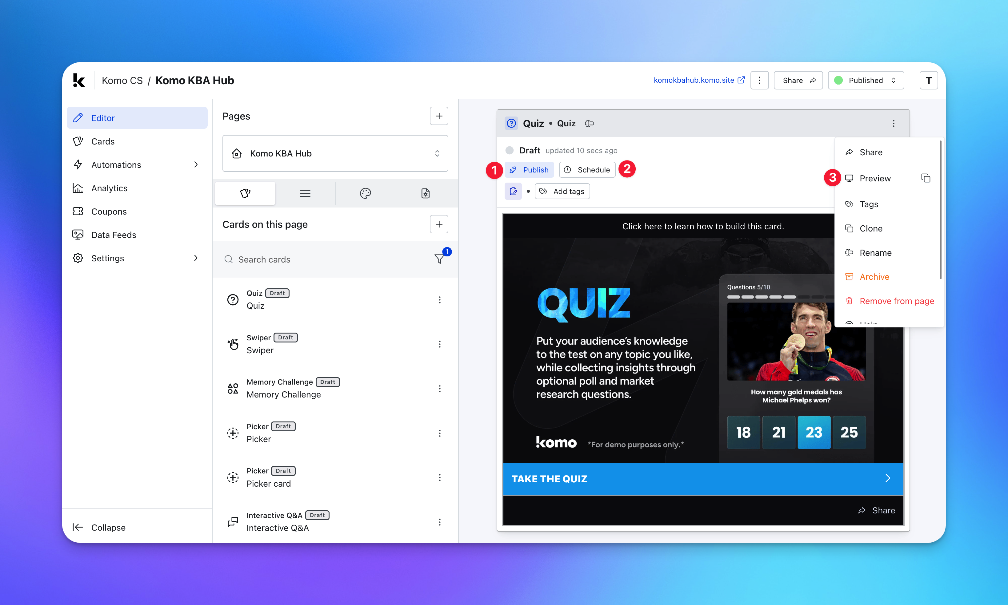 - (3) Click on … to Preview and interact with the card on the front end from a user’s perspective before publishing it. See how to test your card here.