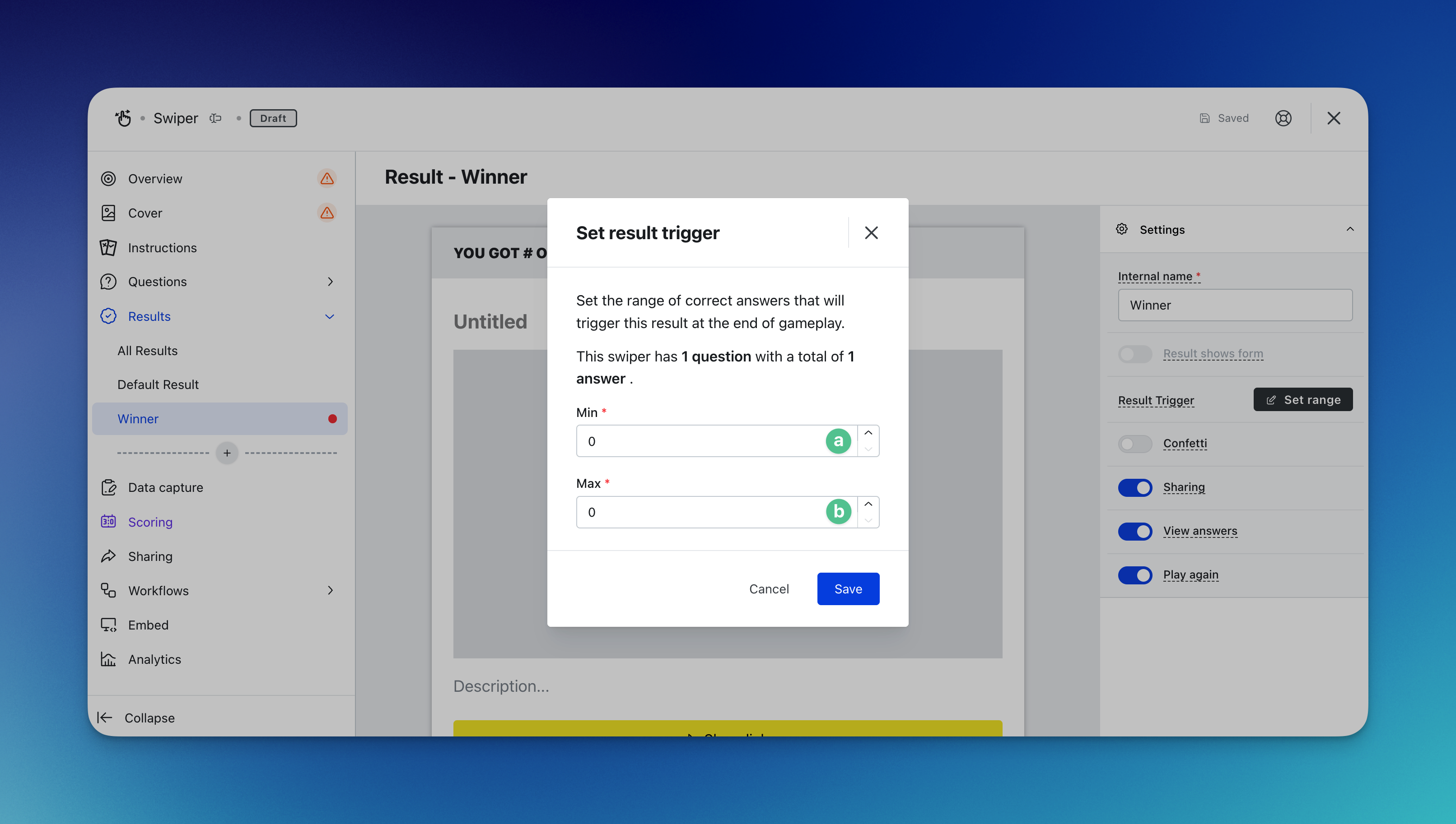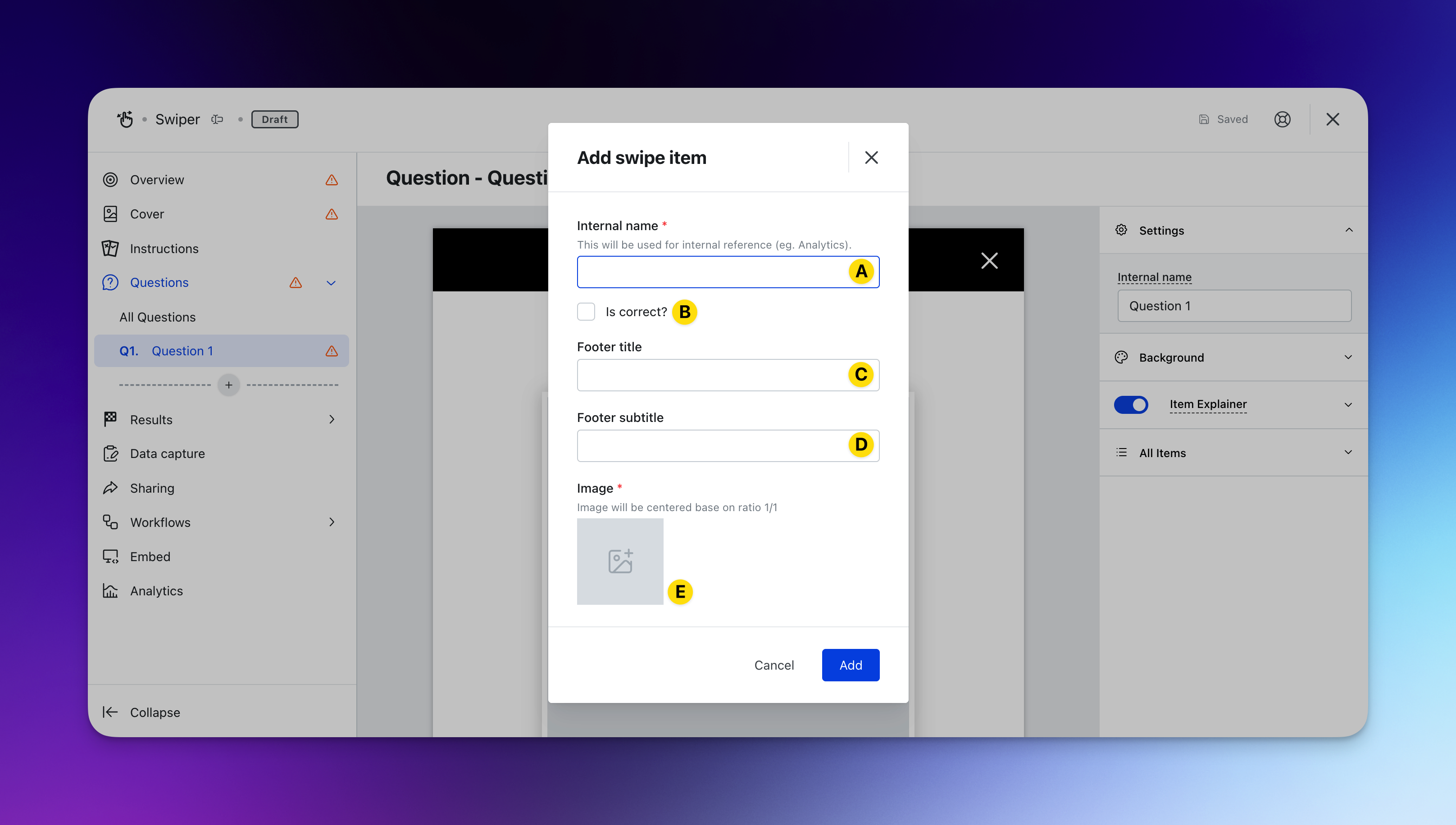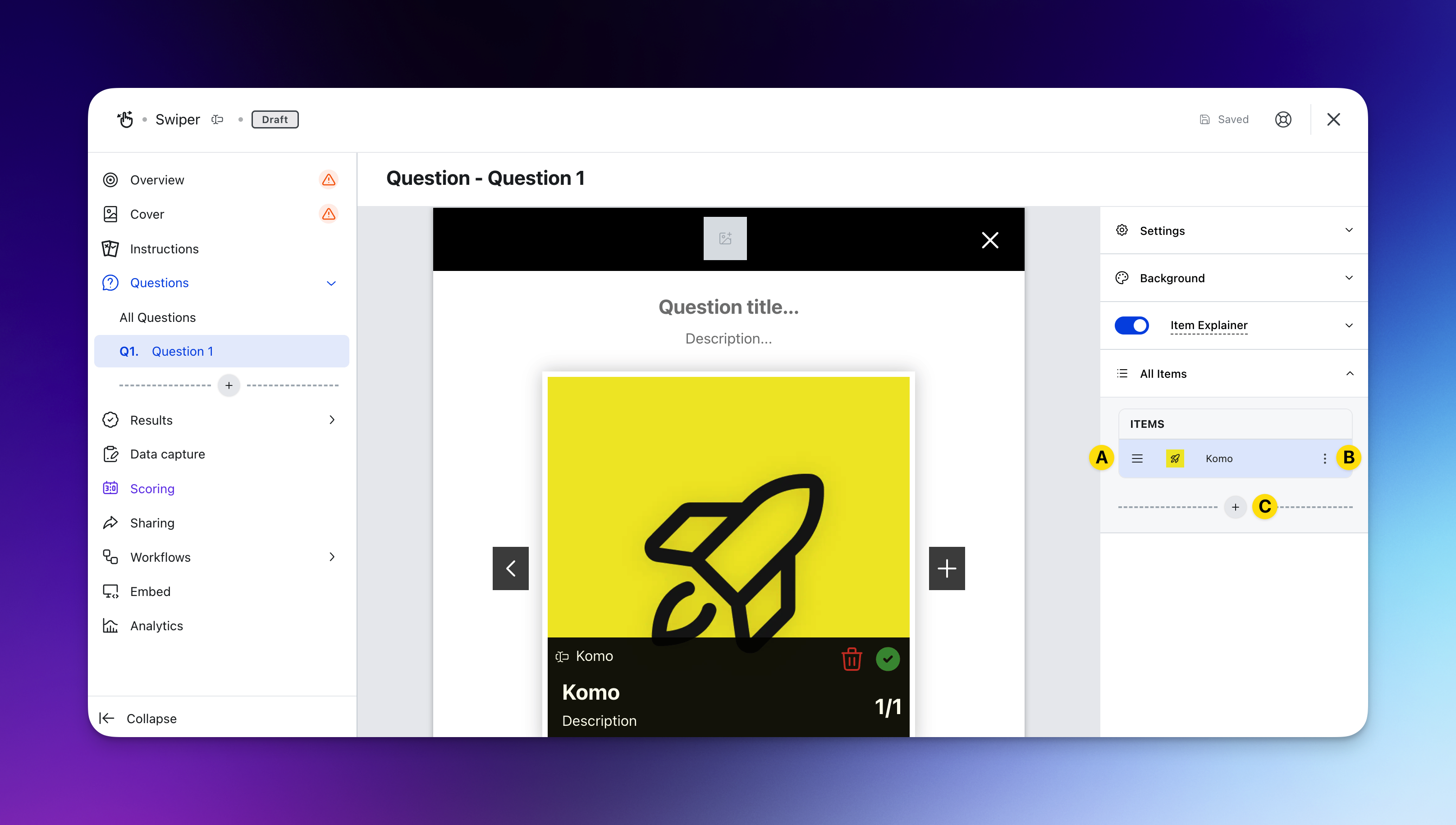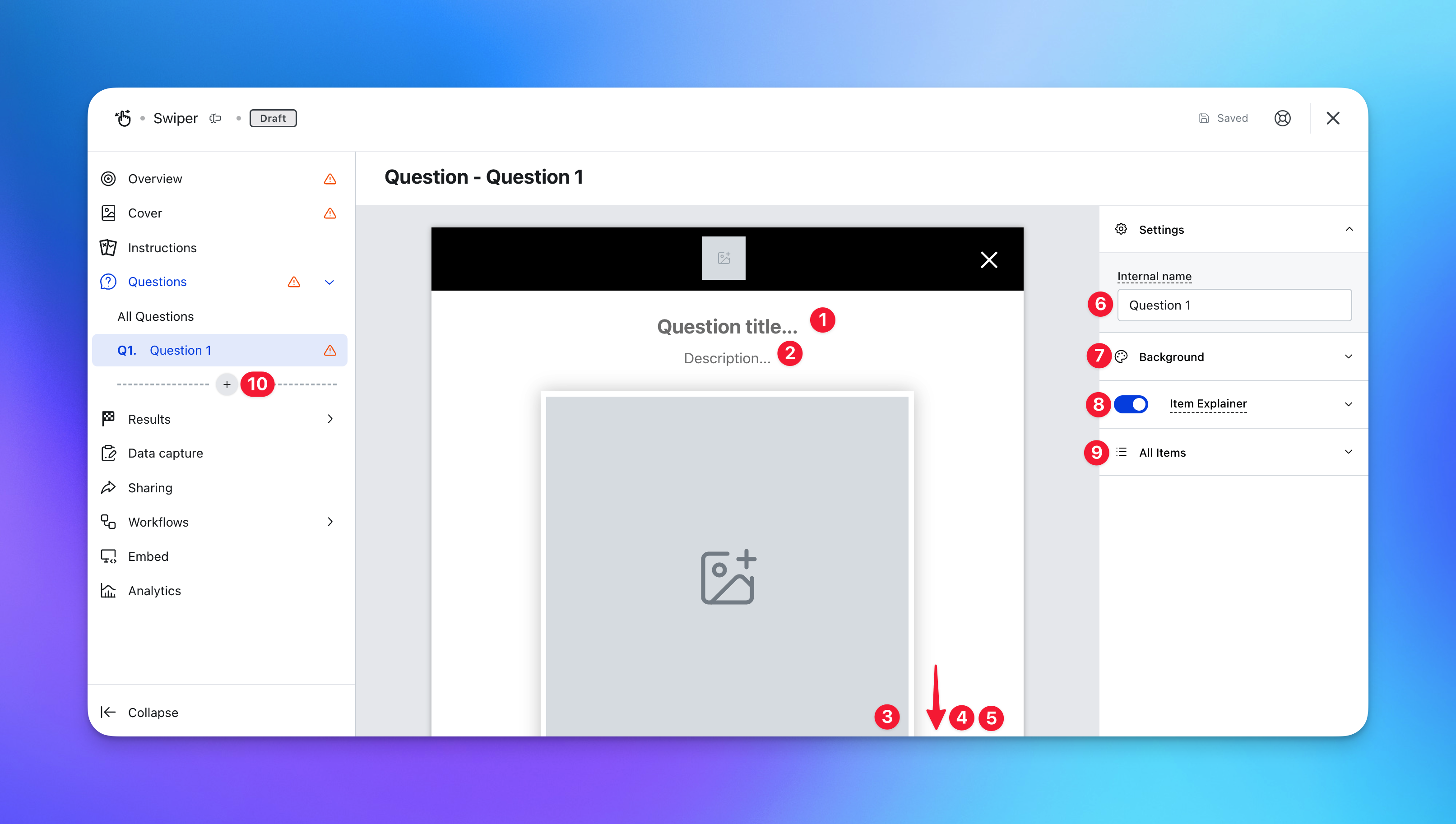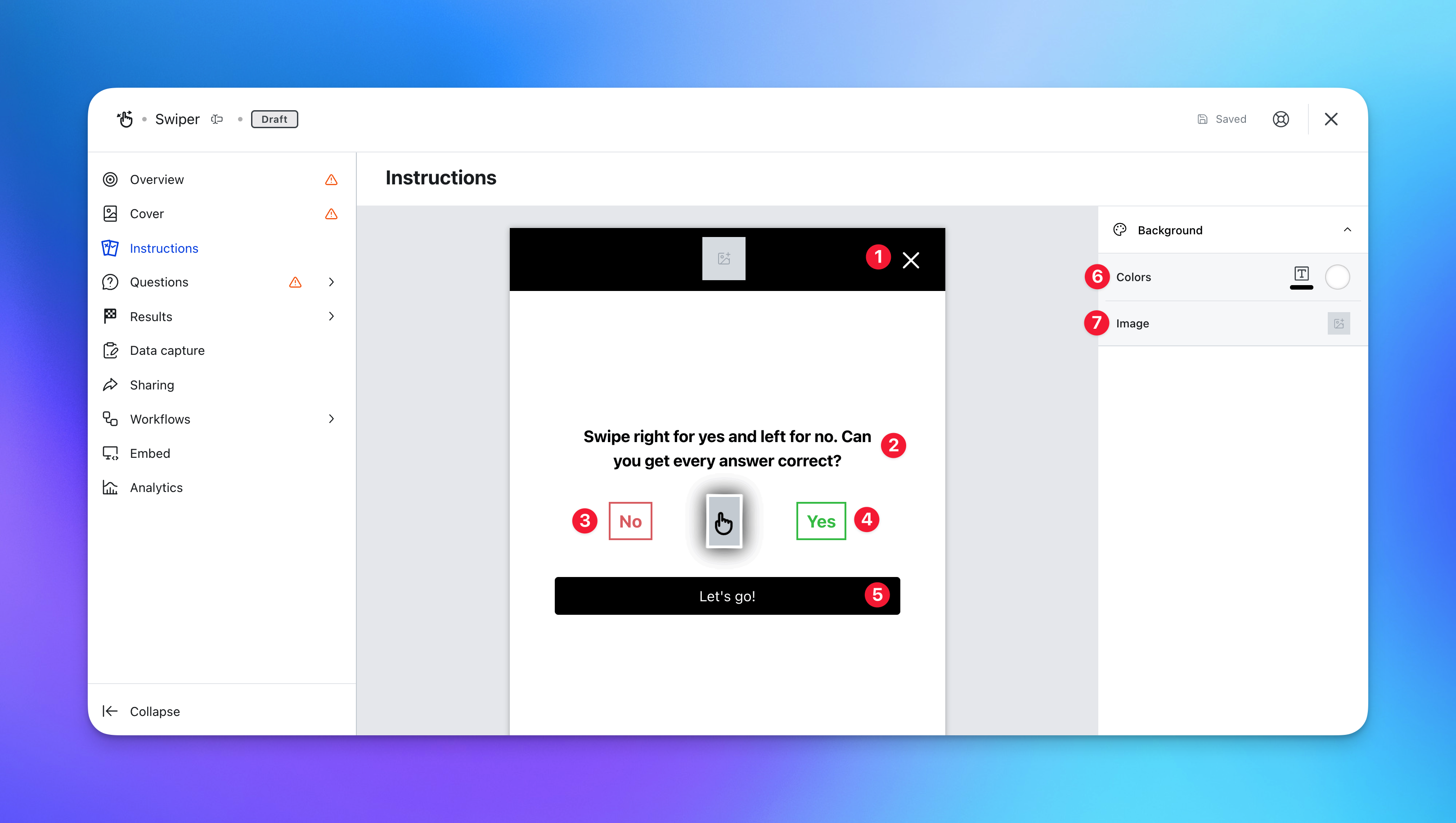 The Swiper card allows you to ask your audience ‘yes or no’ type questions where they get to swipe left or right to answer. This interactive format creates an engaging game-like experience that encourages participation and can be used for quizzes, surveys, or entertainment.How do I build one?
