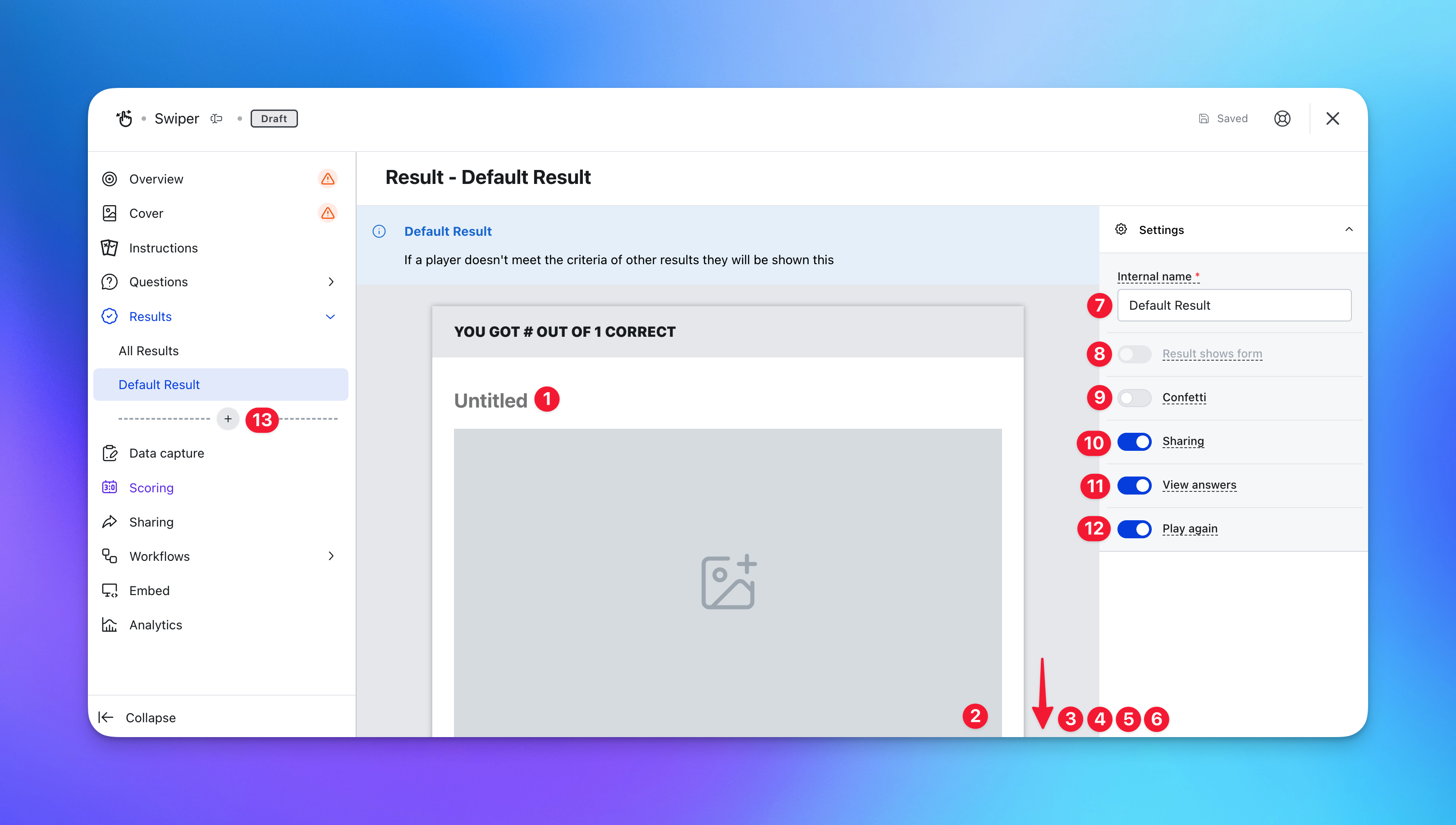- (6) Alter the color and copy of the Play again call-to-action or (12) you can hide this button here
